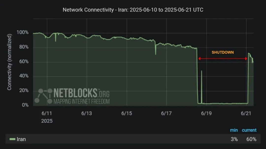 «آمارها نشان میدهد پس از حدود ۶۲ ساعت قطعی اینترنت به دستور دولت، اتصال اینترنت در ایران تا حدی برقرار شده است؛ با این حال، خدمات در برخی مناطق هنوز ضعیف بوده و سطح کلی اتصال کمتر از وضعیت عادی باقی مانده است.»
